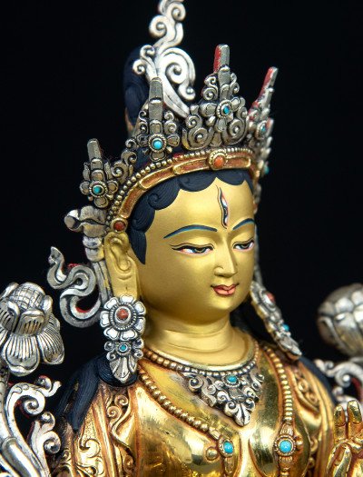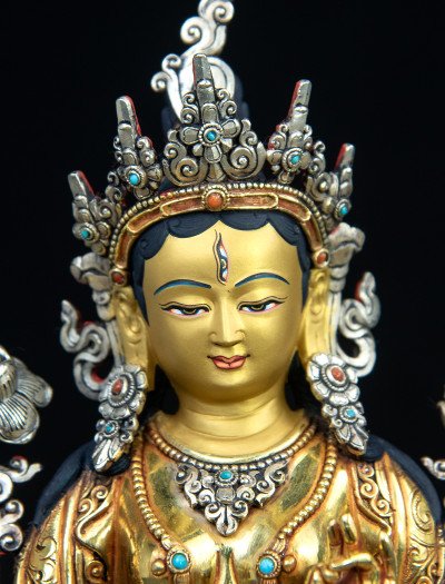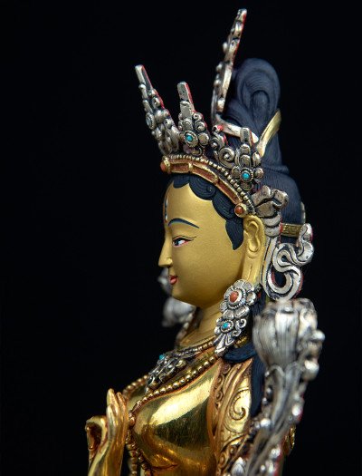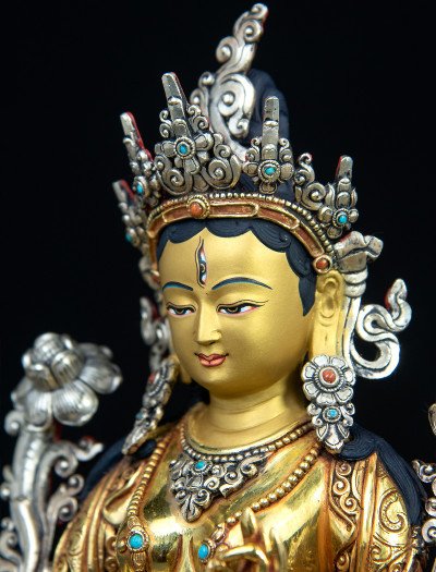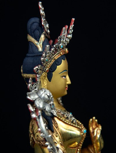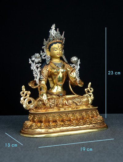 This 9-inch White Tara statue is skillfully crafted from copper, entirely gilded with 24k gold, and delicately plated with silver in select areas such as her crown, creating a balanced harmony of tones and textures.